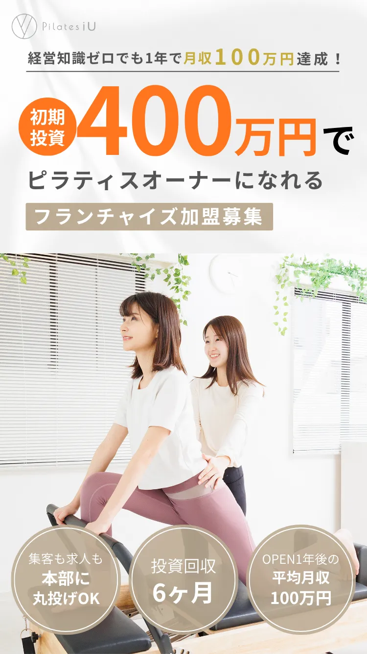 Pilates iU(アイユー)は、初期費用500万円で始められる、投資型に特化したピラティススタジオフランチャイズを展開しています。